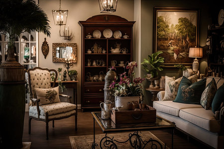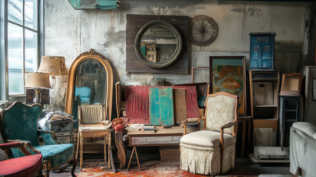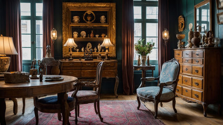 This captivating vintage interior showcases an eclectic mix of antique furniture and unique wall art, creating a cozy and inviting atmosphere perfect for any space.