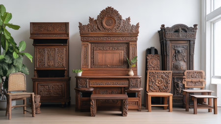 Vintage wooden furniture set with detailed carvings and comfortable cushions creates a warm atmosphere in a beautifully designed interior space