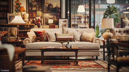 Explore a fashionable living room adorned with exquisite furniture and home decor, all featuring enticing sale tags for shoppers.