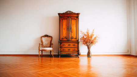 An antique wooden wardrobe and chair are displayed against a clean, white wall. The composition includes dried floral arrangements in a vase. The scene showcases warm, natural light illuminating the wooden textures and creating a serene atmosphere. This image could be suitable for lifestyle and design-related commercial applications.