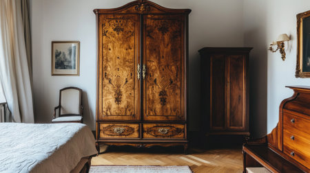 This classic bedroom showcases elegant vintage furniture including a wooden wardrobe and charming accents, creating a warm and inviting atmosphere.