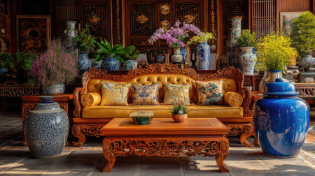 A beautifully arranged traditional Asian living room featuring intricate wooden furniture, colorful pillows, and lush plants, all bathed in warm light.