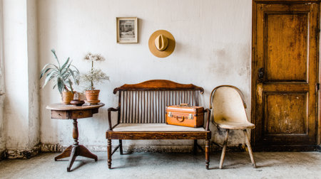 An interior shot showcases a wooden bench, chair, and table. The scene includes decorative elements like a hat, framed art, and a suitcase. Warm tones, and textures suggest a vintage or farmhouse aesthetic. Suitable for editorial use, the image is versatile for design, lifestyle, or commercial applications.