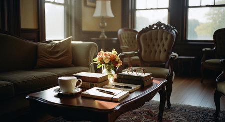 Coffee cup, books and flowers on table in living room