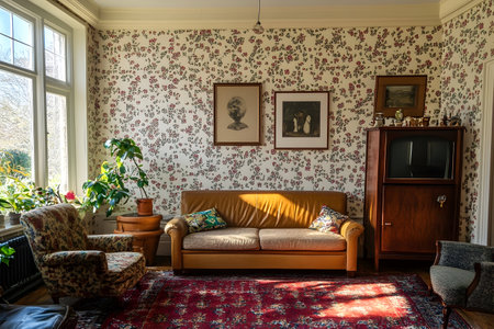 Sunlight fills a charming living room, highlighting floral wallpaper and inviting furnishings.