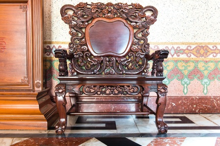 Old large wooden polished chinese chair with brown patterns