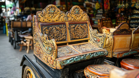 Explore an intricately designed traditional seat featuring ornate carvings in a bustling market setting, showcasing rich craftsmanship and vibrant colors.