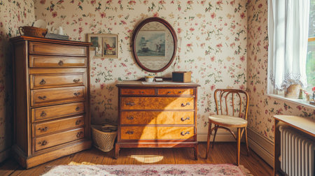 A cozy vintage room featuring wooden furniture and floral wallpaper, bathed in soft sunlight. This inviting space exudes warmth and rustic charm.