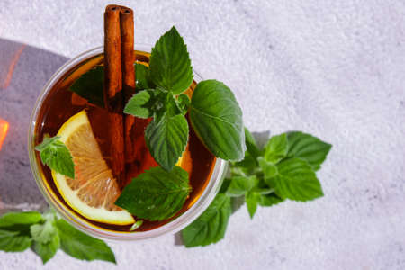 Black and green tea with lemon, cinnamon sticks and mint leaves. Hot drink. Healthy melissa tea natural organic aromatic drink in cup. Summer, Autumn winter warming drink. Stay healthy herbal tea