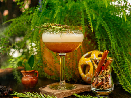 Hot mulled wine in a glass goblet with cinnamon sticks. Vegetation around.