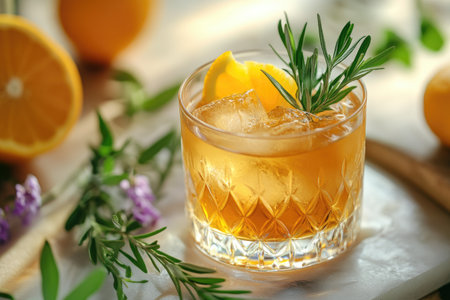 A golden bourbon cocktail served in an elegant glass, with a garnish of herbs and citrus