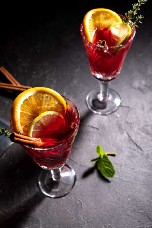 Two glasses of hot mulled wine on restaurant table. Hot yellow and red grog with orange. Tasty Christmas drink, seasonal beverage, date, party, relaxation concept