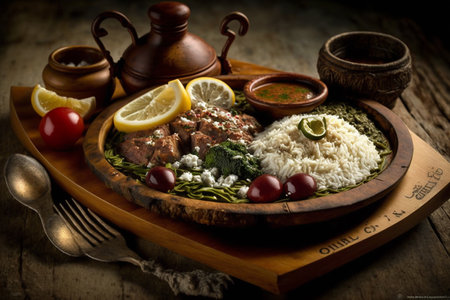 Assorted middle eastern cuisine with stuffed grape leaves and couscous on patterned tablecloth. That the image is generated using AI.