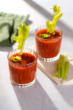 Bloody mary alcoholic cocktail with red tomato, lemon juice, hot sauce, green celery and russian vodka, black stone background, top view