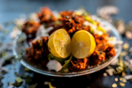 Indian styled meatballs or kabab or kebab on glass plate along with sprinkled cut green chilies and onion rings plus lemon.