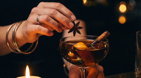 A hand carefully places a star anise into a sophisticated cocktail, garnished with a cinnamon stick and orange peel. A warm candle glow illuminates the scene, creating an inviting and elegant mood.