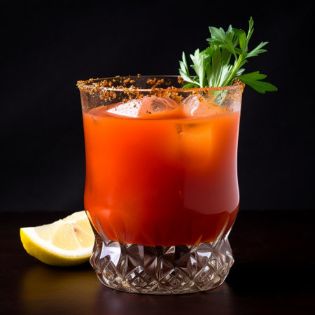Indulge in the bold and spicy taste of the Bloody Mary cocktail served in a short glass with a frosted rim. Made with vodka, clam juice, tomato juice, and various spices, this drink has a savory and slightly tangy taste with a spicy kick. A thin slice of lemon or a sprig of fresh herbs is garnished on the rim, making it look colorful and flavorful. Perfect for a brunch or a casual gathering!