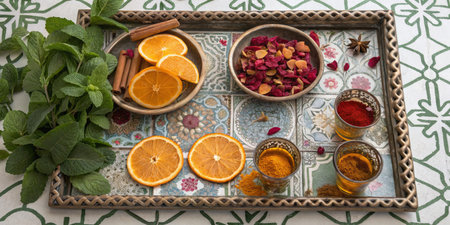 Fresh mint, orange slices, and bowls filled with spices create a lively arrangement. This setup exudes warmth and invites viewers to explore various flavors and aromas.