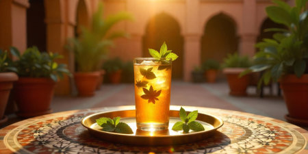 A glass of iced tea garnished with fresh mint sits on an ornate tray in a serene courtyard, surrounded by lush greenery as the sun sets, casting warm light.