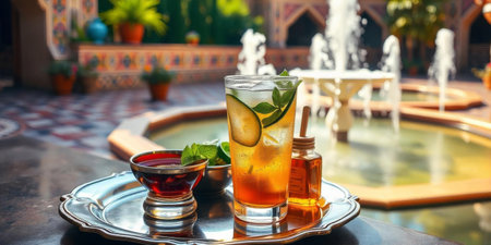 A glass of iced drink with mint and lime sits on a silver tray beside a small bowl of honey, set in a colorful courtyard with a beautiful fountain.