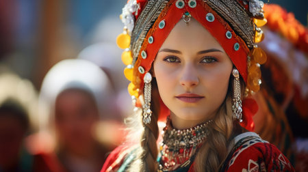 cropped image of a young woman wearing traditional headgear, created with generative ai