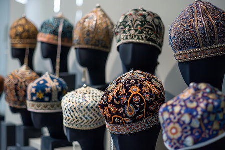 Row of mannequin heads wearing colorful traditional skullcaps with intricate embroidery
