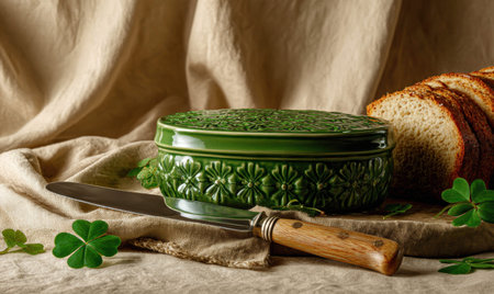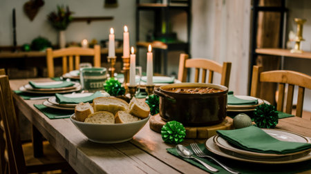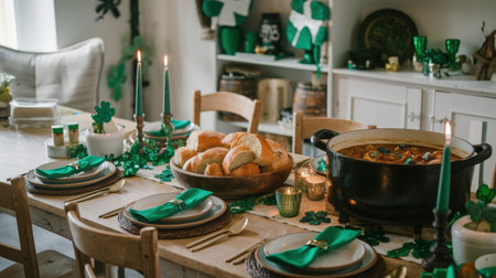 A beautifully arranged table for St. Patrick's Day, featuring vibrant green decorations, fresh bread, and a hearty pot of stew. This inviting setup captures the spirit of celebration and togetherness during this festive occasion