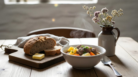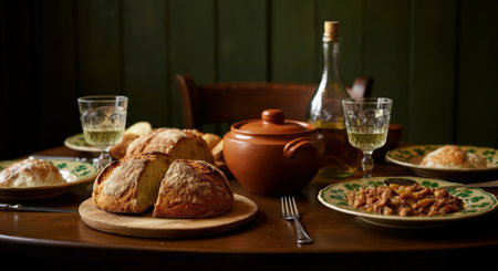 A charming rustic table adorned with freshly baked bread, a pot of stew, and glasses of wine. This inviting scene captures the essence of home-cooked meals and shared moments, perfect for gatherings and celebrations