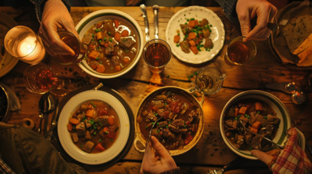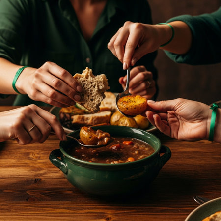 Close-up of diverse hands sharing traditional Irish stew and soda bread at a St. Patrick's Day community table, emphasizing unity and warm lighting.