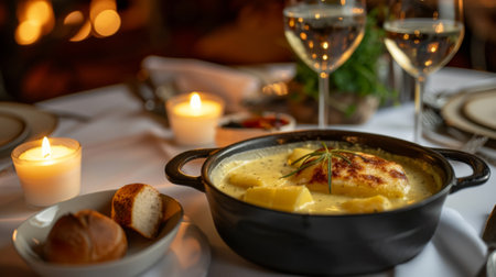 A rich and atmospheric shot of steaming veal stew served in a classic French bistro, paired with crusty bread for dipping, illuminated by warm candlelight for a cozy dining experience. AI-generated