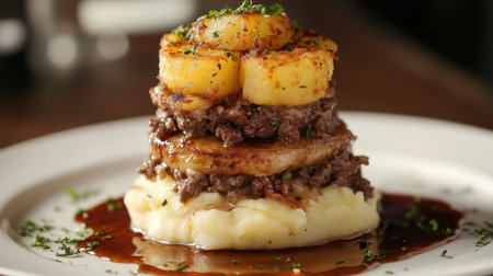 Indulge in this layered meal featuring savory beef, golden potatoes, and rich sauce served atop fluffy mashed potatoes. A treat for food lovers!