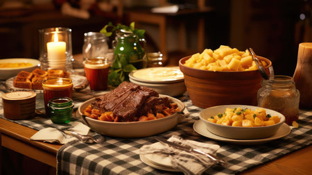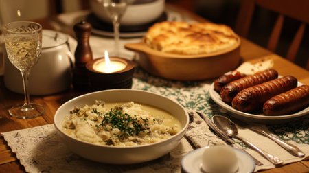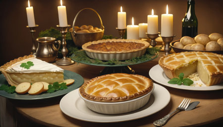 A cozy traditional Irish meal setup with lit candles, featuring savory pies, a cheese wheel, and potatoes, perfect for a cultural culinary stock photo.. AI Generation
