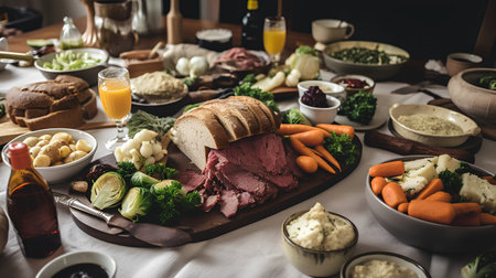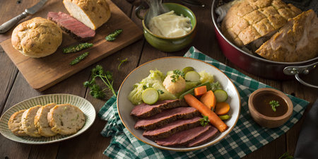 Traditional Irish dinner with corned beef, soda bread and colcannon overhead shot