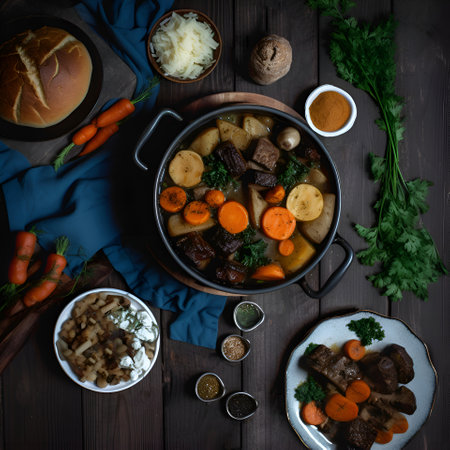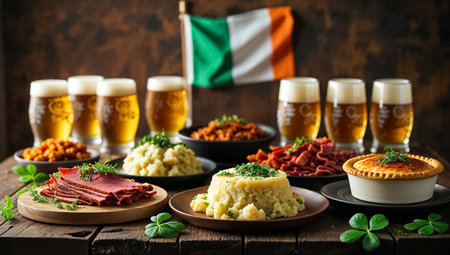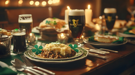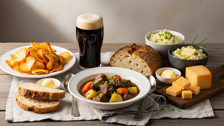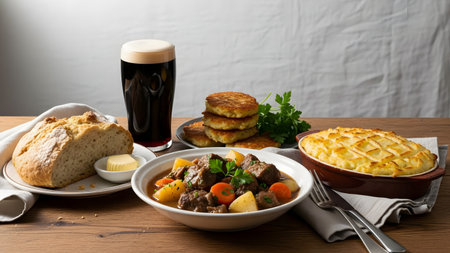 A hearty traditional meal featuring a bowl of beef stew with potatoes and carrots, served alongside shepherd's pie, soda bread, and a pint of stout beer. The rustic wooden table setting evokes a cozy atmosphere suitable for St. Patrick's Day.