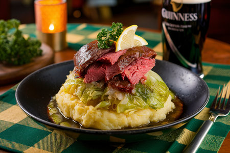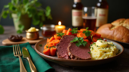Enjoy a festive St Patricks Day dinner featuring tender slow-cooked corned beef accompanied by carrots, mashed potatoes, and drinks.