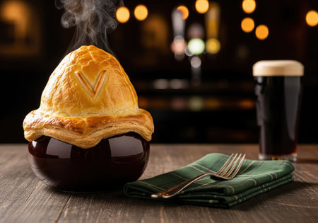 Steaming steak and mushroom pot pie with puff pastry crust and dark beer mug on wooden table, traditional British tavern food.