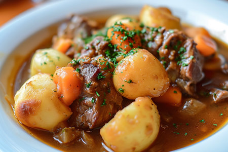 Enjoy a delicious bowl of hearty beef stew featuring tender meat, fresh vegetables, and aromatic herbs. Perfect for a comforting meal any time.