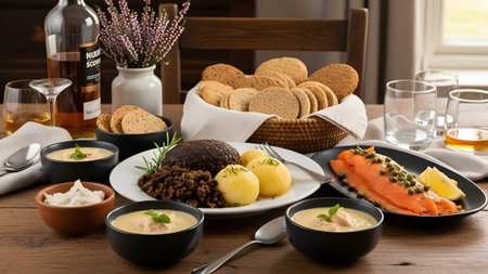 A bountiful Scottish feast spread on a wooden table, featuring haggis, boiled potatoes, smoked salmon with capers, creamy soup, and a basket of oatcakes. A bottle of whisky and glasses complete the traditional culinary setting.