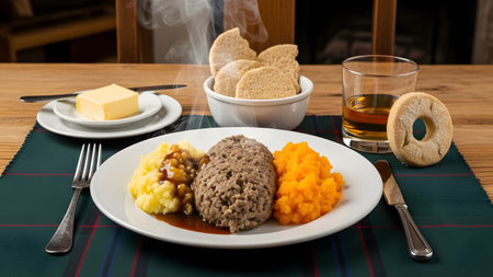 A traditional Scottish feast featuring a savory haggis served with mashed turnips and potatoes, known as neeps and tatties. The meal is accompanied by oatcakes, butter, and a glass of whisky, celebrating classic Burns Night cuisine.