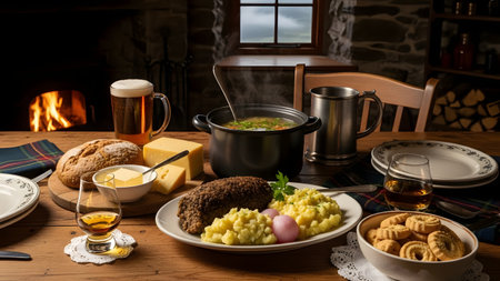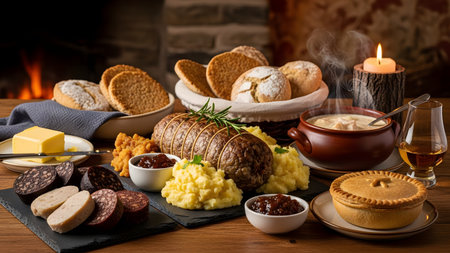 A traditional Scottish feast featuring a whole haggis, mashed turnips and potatoes, meat pies, and oatcakes. A glass of whisky and a candle add to the cozy, cultural setting, perfect for Burns Night.