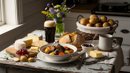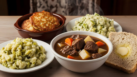 A hearty Irish meal featuring a bowl of lamb stew with potatoes and carrots, served with potato pancakes (boxty), colcannon, soda bread, and a pint of stout beer. A comforting and traditional feast.