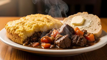 A hearty serving of Shepherd's or Cottage pie features a golden mashed potato crust over savory minced meat. The dish is plated with chunks of stewed beef, carrots, and a slice of bread, steaming with warmth and flavor.