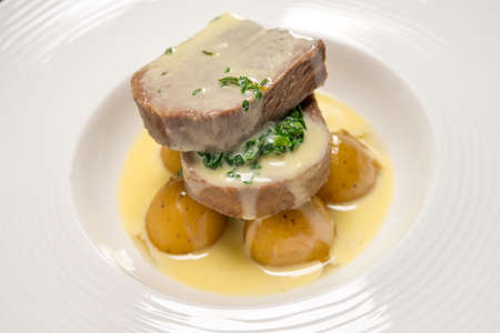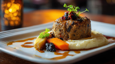 Gourmet meatloaf dish with mashed potatoes and vegetables on white plate.