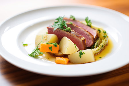 Top-down shot of slow-cooked beef with fragrant herbs, served in a rustic ceramic bowl, highlighting rich textures and flavors.