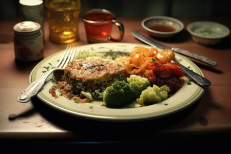 A simple and appetizing plate of food is displayed on a table, accompanied by a fork and knife. This image can be used to showcase delicious meals, dining experiences, or restaurant promotions.