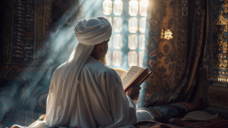 Muslim man praying inside of the mosque. Ramadan Kareem concept.