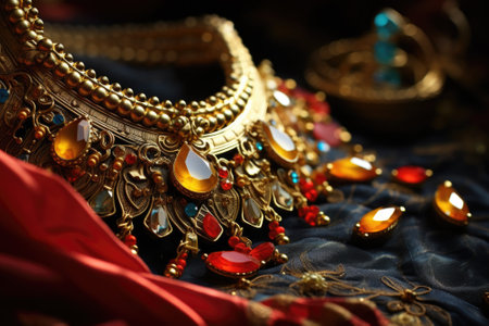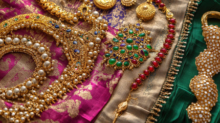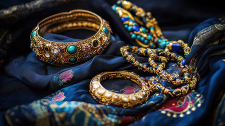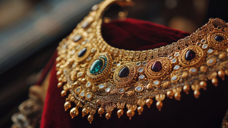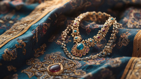 Discover an exquisite closeup of elegant jewelry adorned on rich fabric, showcasing intricate designs and luxurious embellishments. Perfect for fashion or culture-themed projects.