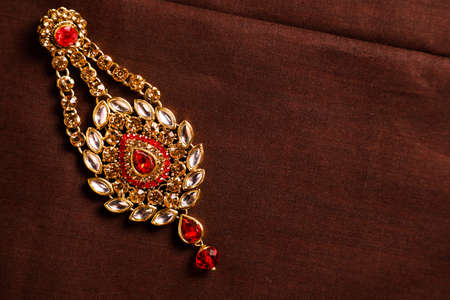 Indian bridal jewelry set for wedding close up. Concept of oriental culture.