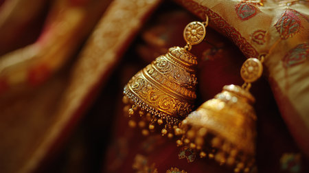 This stunning close-up captures exquisite traditional gold earrings adorned with intricate designs, perfectly complementing the rich embroidered fabric.