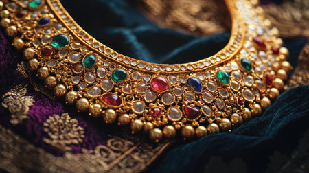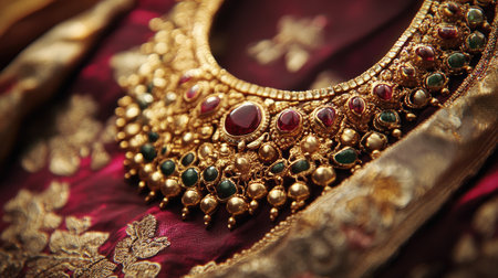 Close-up of a luxury Indian bridal necklace, with intricate gold patterns and rich gemstones, beautifully displayed on a silk background